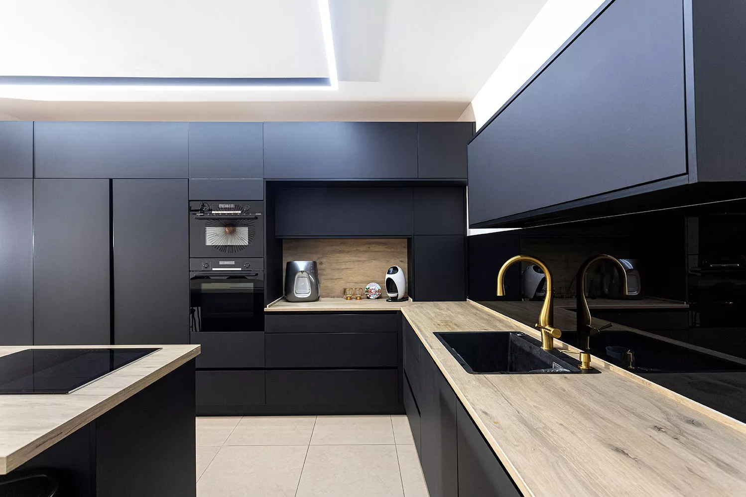 השילוב בין החומרים הוא המפתח: חזיתות עץ בהיר יוצרות הרמוניה מושלמת עם שיש כהה, בעוד שמטבחים לבנים מקבלים עומק ועניין בזכות שיש בעל גוון דרמטי או טקסטורה טבעית.